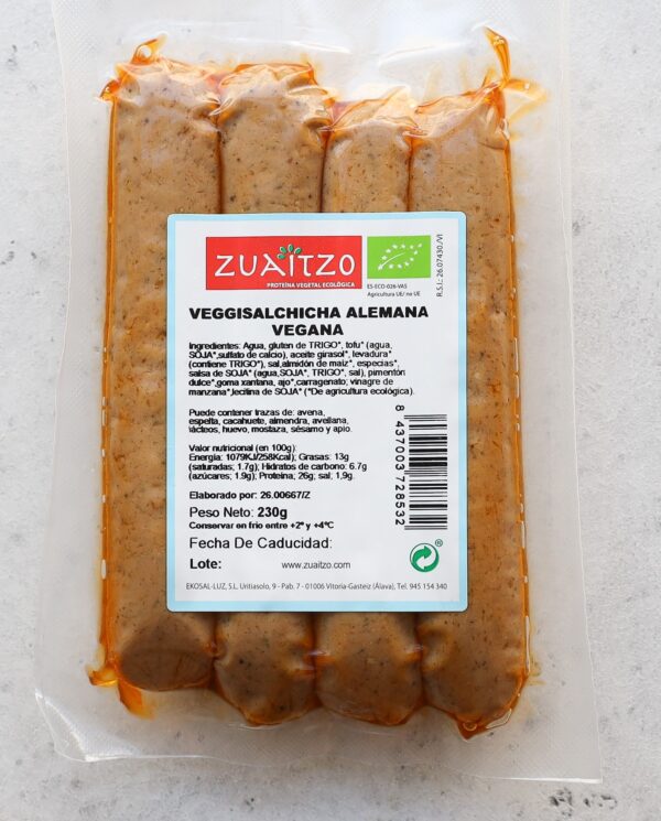 Presentación: las salchichas Zuaitzo se presentan en formato de 2 unidades con un peso neto de 230g, con un film plástico y envasadas al vacío. En la etiqueta de cada variedad de salchicha se indican la fecha de caducidad, peso neto, lote, ingredientes, valor nutricional y el sello regulador de agricultura ecológica.